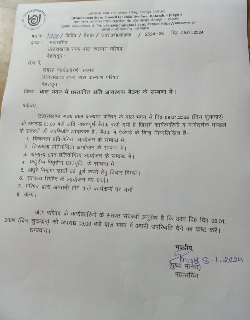 A very important meeting has been scheduled at Bal Bhawan of Uttarakhand State Child Welfare Council on 08.01.2025 (Friday) at 03.00 pm in which the presence of the members of the Executive and Guidance Board is necessary. The agenda points of the meeting are as follows-