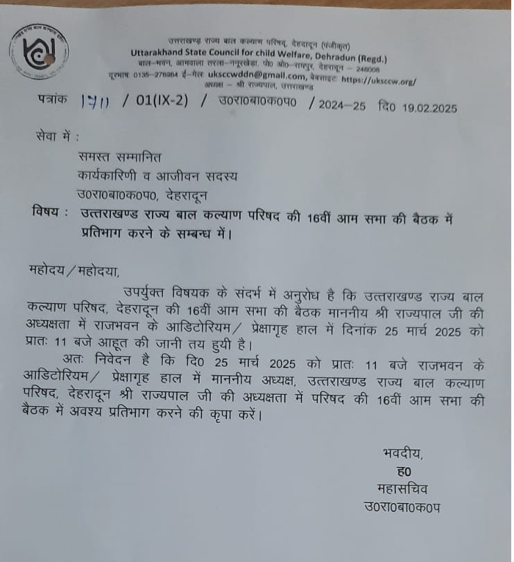 Therefore, it is requested that you please participate in the 16th general meeting of the Council under the chairmanship of the Honorable Chairman, Uttarakhand State Child Welfare Council, Dehradun, Shri Governor ji in the auditorium / auditorium hall of Raj Bhawan on 25 March 2025 at 11 am.